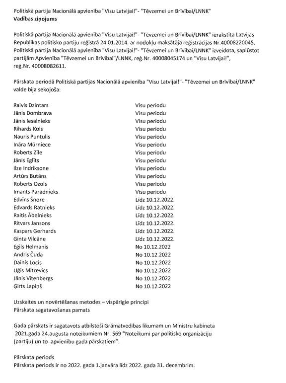 Politiskās partijas "Nacionālā apvienība "Visu Latvijai!" - "Tēvzemei un Brīvībai/LNNK"", reģ. Nr. 40008220045, precizēts gada pārskats par 2022.gadu
