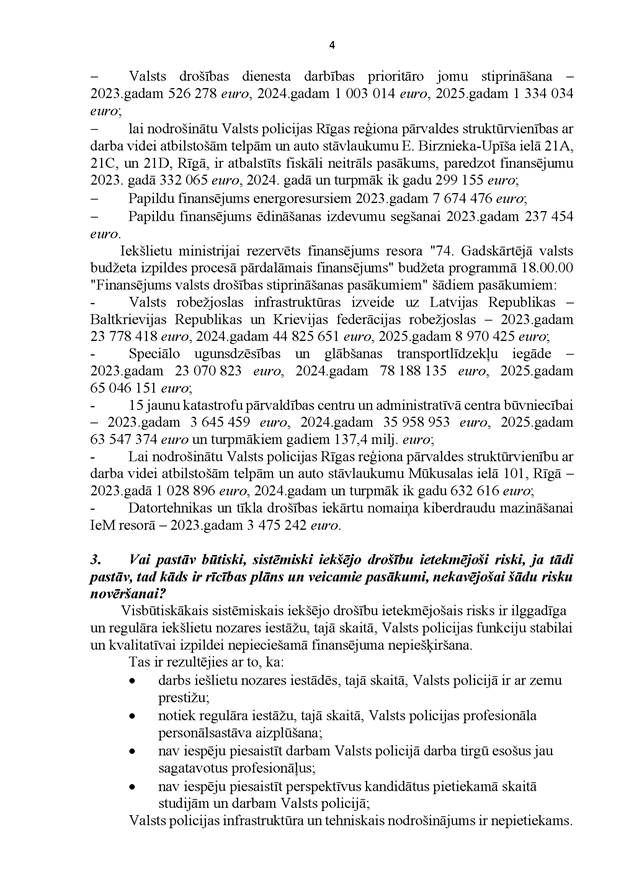 Visbeidzot – sekmīgai krīžu pārvarēšanai var būt ļoti nepieciešamas materiālās rezerves. Iepriekšējos četros gados finansējums to veidošanai netika piešķirts, lai gan katru gadu tāds tika prasīts. Šī gada budžeta finansējums ir piešķirts vismaz Ekonomikas ministrijai materiālo rezervju veidošanai, un mūsu aicinājums būtu, ka resoriem finansējums šādām vajadzībām nebūtu jāprasa katru gadu caur prioritārajiem pasākumiem, bet jau jāiekļauj bāzes finansējumā, jo mūsu iedzīvotāju drošība un izdzīvošana katastrofu gadījumos nav ekstra, bet gan pirmā nepieciešamība.