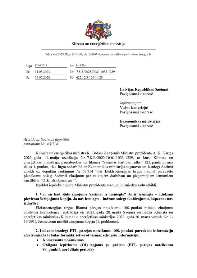 Rakstveidā sniegtās atbildes uz deputātu jautājumiem