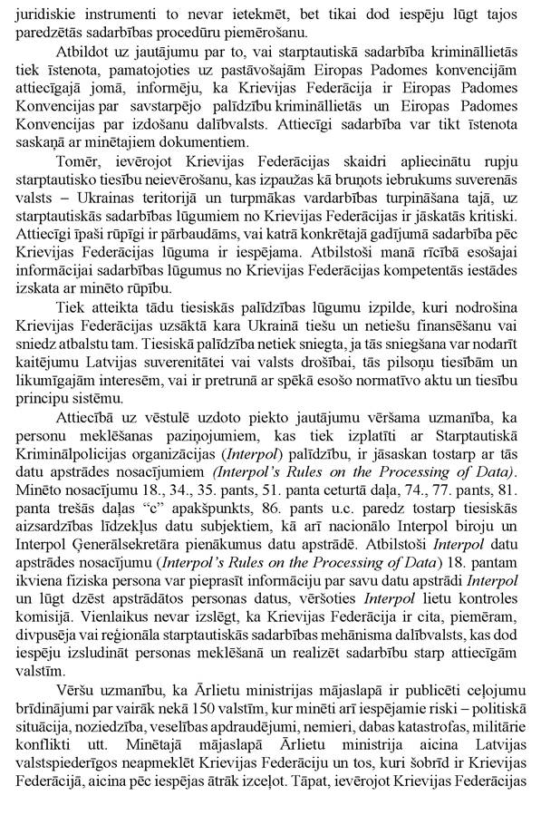 Deputātu Ramonas Petravičas, Ričarda Šlesera, Kristapa Krištopana, Lindas Liepiņas un Edmunda Zivtiņa jautājums iekšlietu ministram Rihardam Kozlovskim "Par tiesisko palīdzību un tiesiskajām attiecībām civillietās, ģimenes lietās un krimināllietās ar Krievijas Federāciju". Saņemtā rakstveida atbilde iesniedzējus apmierina.