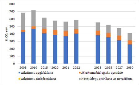Apsaimniekotiem atkritumu apglabāšanas objektiem tika izmantota 2006. g. KPSP atkritumu modelī izmantotā pirmās pakāpes sabrukšanas metode "atkritumi pēc sastāva". Atkritumu sastāvs balstīts uz SIA Virsma 2011. g. pētījuma "Degradējamā organiskā oglekļa daļas noteikšana apglabātos atkritumos". Šis atkritumu sastāvs tiek piemērots līdz 2015. g. Sākot no 2016. g., tiek izmantots atkritumu sastāvs no ikgadējiem poligonu ziņojumiem.