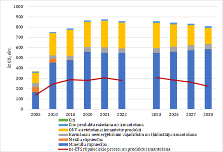 SEG emisiju prognozes rūpnieciskajos procesos tiek aprēķinātas, izmantojot lejupejošu (top-down) uzskaites modeli. Modelis ietver gan darbības datu projekciju, gan SEG emisiju aprēķinus. SEG emisiju aprēķināšanai tiek izmantoti pēdējā iesniegtā inventarizācijas emisiju faktori, kas ir nemainīgi visā prognozētajā laika periodā. Savukārt nepieciešamie darbības dati tiek prognozēti, balstoties uz vēsturiskajiem datiem un makroekonomiskajiem parametriem, kas raksturo konkrētas nozares attīstību (pievienotās vērtības jeb rūpnieciskās ražošanas indekss).