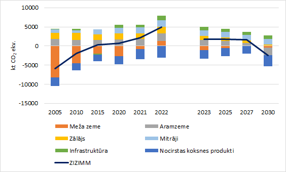MRM un pētījumu datus izmanto, lai novērtētu platības, bruto pieauguma, mirstības un koksnes ieguves laikrindas. SEG emisiju prognožu aprēķināšanas metodika ZIZIMM sektoram ir saskanīga ar 2024. g. SEG inventarizācijā pielietoto metodiku. Kokaudžu augšanas gaitas, saimnieciskās darbības un dabisko traucējumu radīto risku prognozēšanai Bāzes scenārijā un īstenojot klimata pārmaiņu mazināšanas scenāriju izmantots AGM modelis, kas pielietots arī Latvijas meža references līmeņa noteikšanai26. Aprēķinos pieņemts, ka mežsaimnieciskās darbības ierobežojumi saglabājas esošajā līmenī.