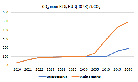 Modelējot enerģētikas sistēmu vērā tiek ņemti visi spēkā esošie nodokļi ar to likmēm pieņēmumi par to attīstību nākotnē. Papildus prognožu aprēķināšanā tiek ņemts vērā arī EK izstrādātās prognozes24 par CO2 cenu ETS sistēmā līdz 2050.g.