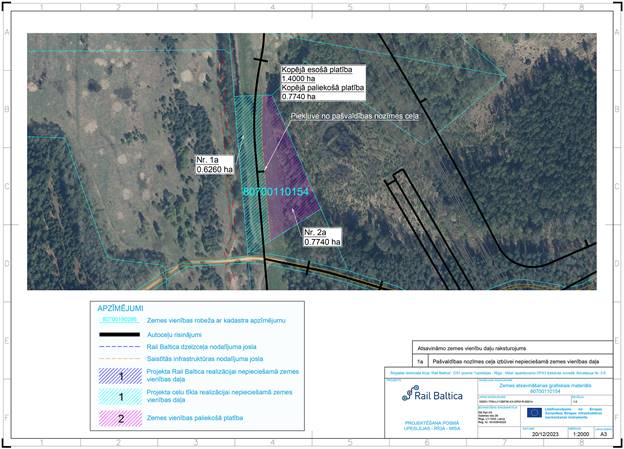 Nodalot Rail Baltica projekta īstenošanai nepieciešamo (atsavināmo) Zemes vienības daļu aptuveni 0,6260 ha platībā (grafiskajā materiālā 1a), atlikumā veidojas Zemes vienības daļa aptuveni 0,7740 ha (grafiskajā materiālā 2a).