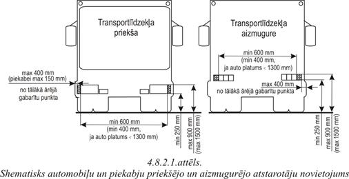 1) numura zīmes viduspunkts nedrīkst atrasties pa labi no transportlīdzekļa gareniskās simetrijas plaknes. Numura zīmes kreisā sānu mala nedrīkst atrasties pa kreisi no vertikālās plaknes, kas ir paralēla gareniskās simetrijas plaknei un pieskaras vistālāk izvirzītajam transportlīdzekļa sānu gabarīta punktam;