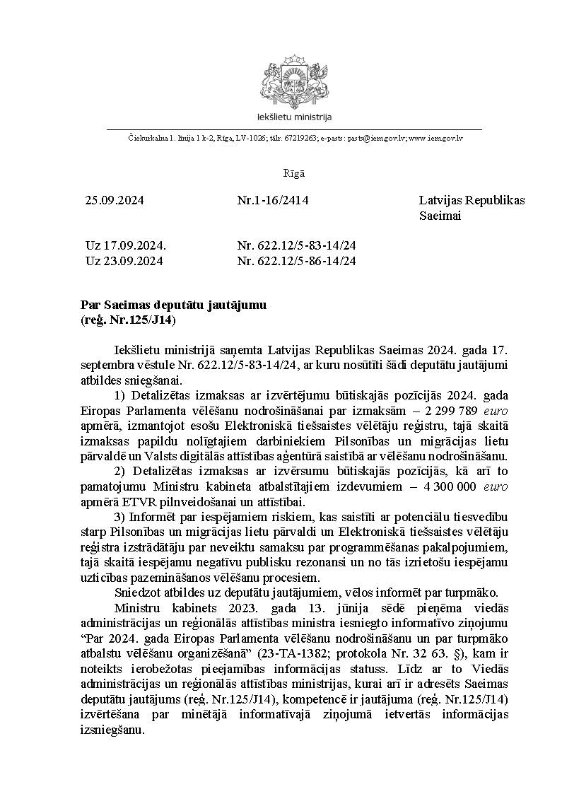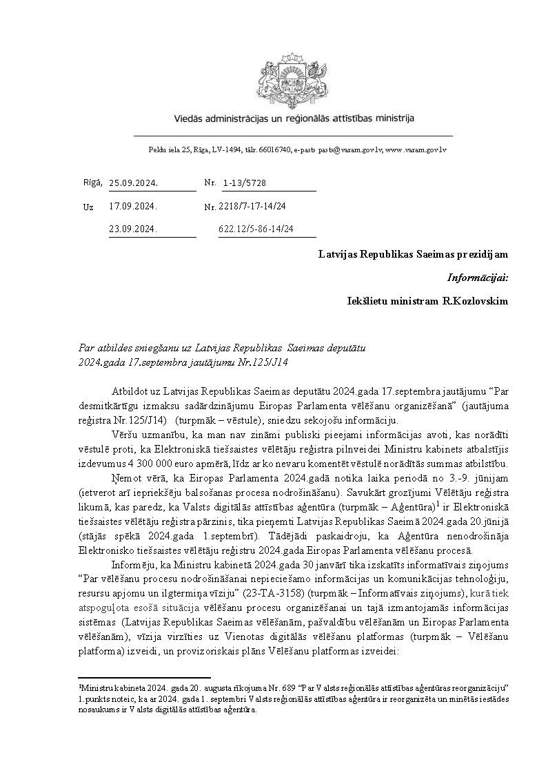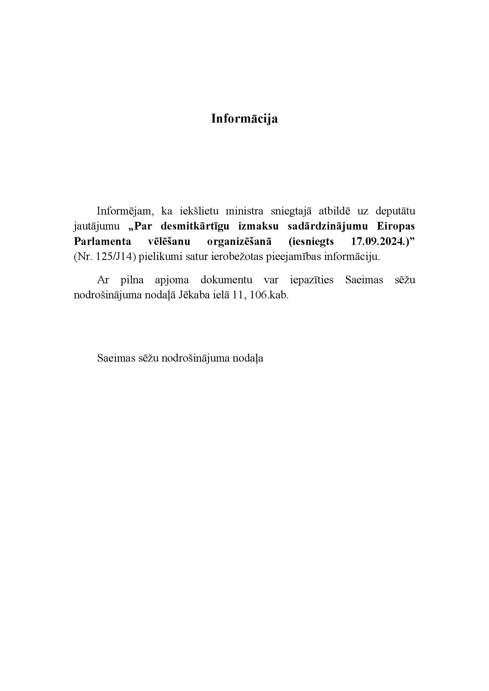 Deputātu Aināra Šlesera, Ilzes Stobovas, Edmunda Zivtiņa, Lindas Liepiņas un Kristapa Krištopana jautājums iekšlietu ministram Rihardam Kozlovskim un viedās administrācijas un reģionālās attīstības ministrei Ingai Bērziņai "Par desmitkārtīgu izmaksu sadārdzinājumu Eiropas Parlamenta vēlēšanu organizēšanā". Saņemtā rakstveida atbilde iesniedzējus neapmierina, bet mutvārdos papildjautājumus uzdot viņi nevēlas.
