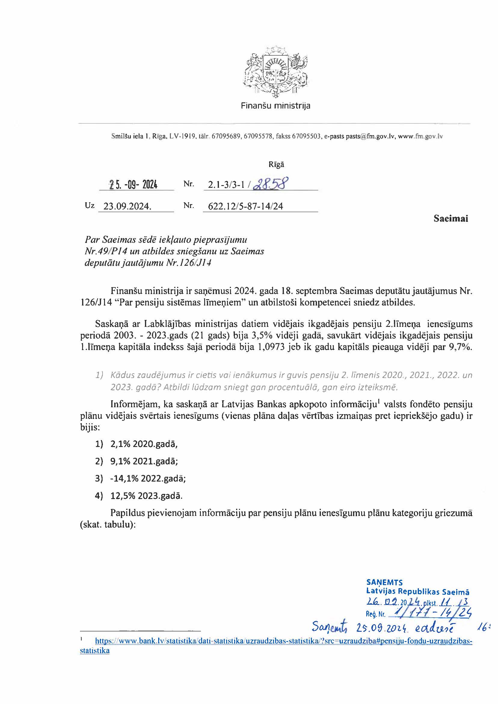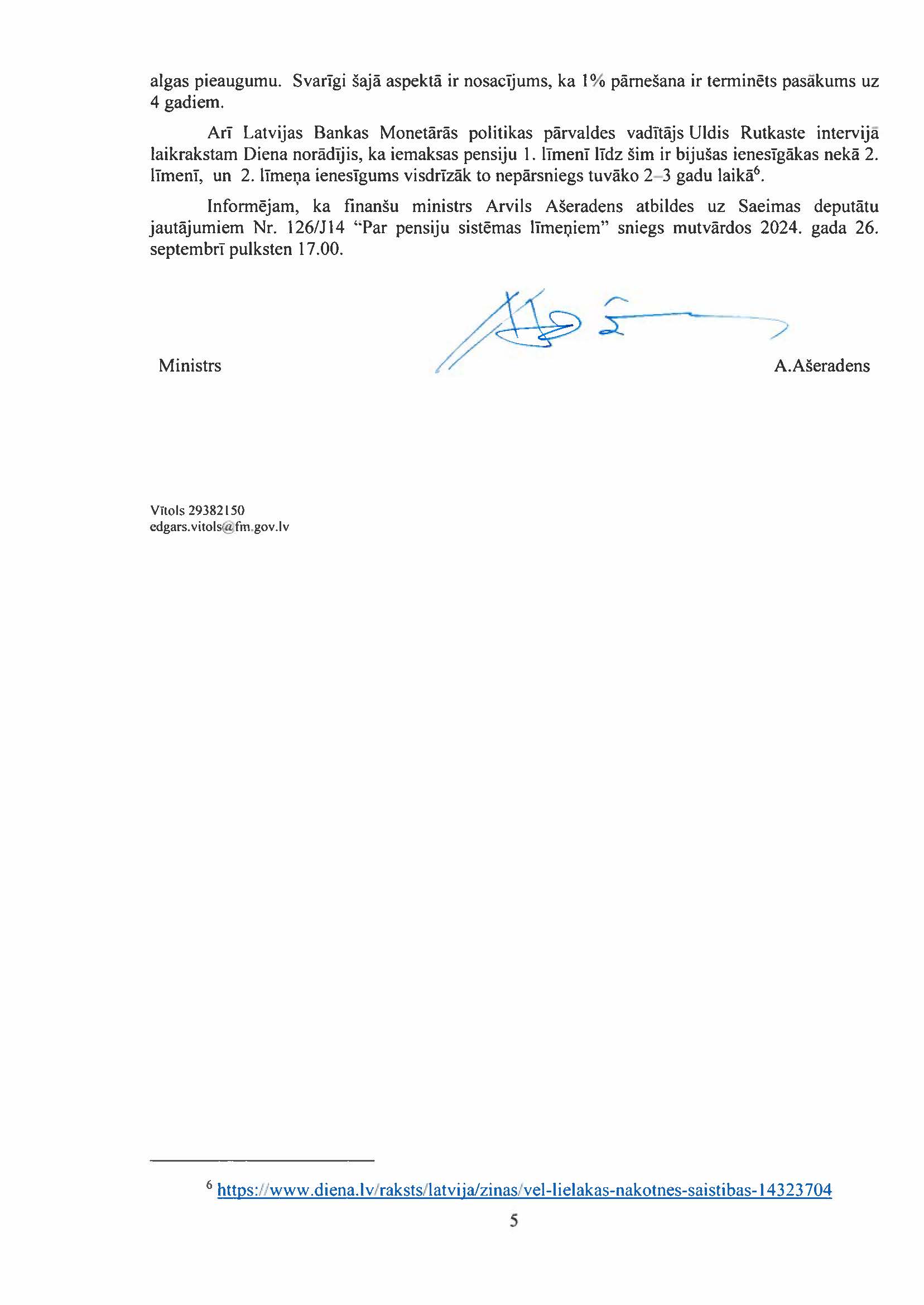 Deputātu Aināra Šlesera, Lindas Liepiņas, Kristapa Krištopana, Ramonas Petravičas un Ričarda Šlesera jautājums finanšu ministram Arvilam Ašeradenam "Par pensiju sistēmas līmeņiem". Saņemtā rakstveida atbilde iesniedzējus apmierina.