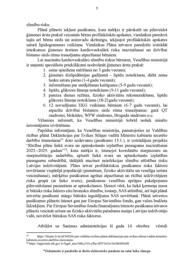 Deputātu Lindas Liepiņas, Aināra Šlesera, Mārča Jencīša, Viktorijas Pleškānes un Edmunda Zivtiņa jautājums veselības ministram Hosamam Abu Meri "Par bērnu un jauniešu sirds un asinsvadu sistēmas slimību attīstību, diagnostiku un profilaksi". Saņemtā rakstveida atbilde iesniedzējus neapmierina, bet mutvārdos papildjautājumus deputāti nevēlas uzdot.