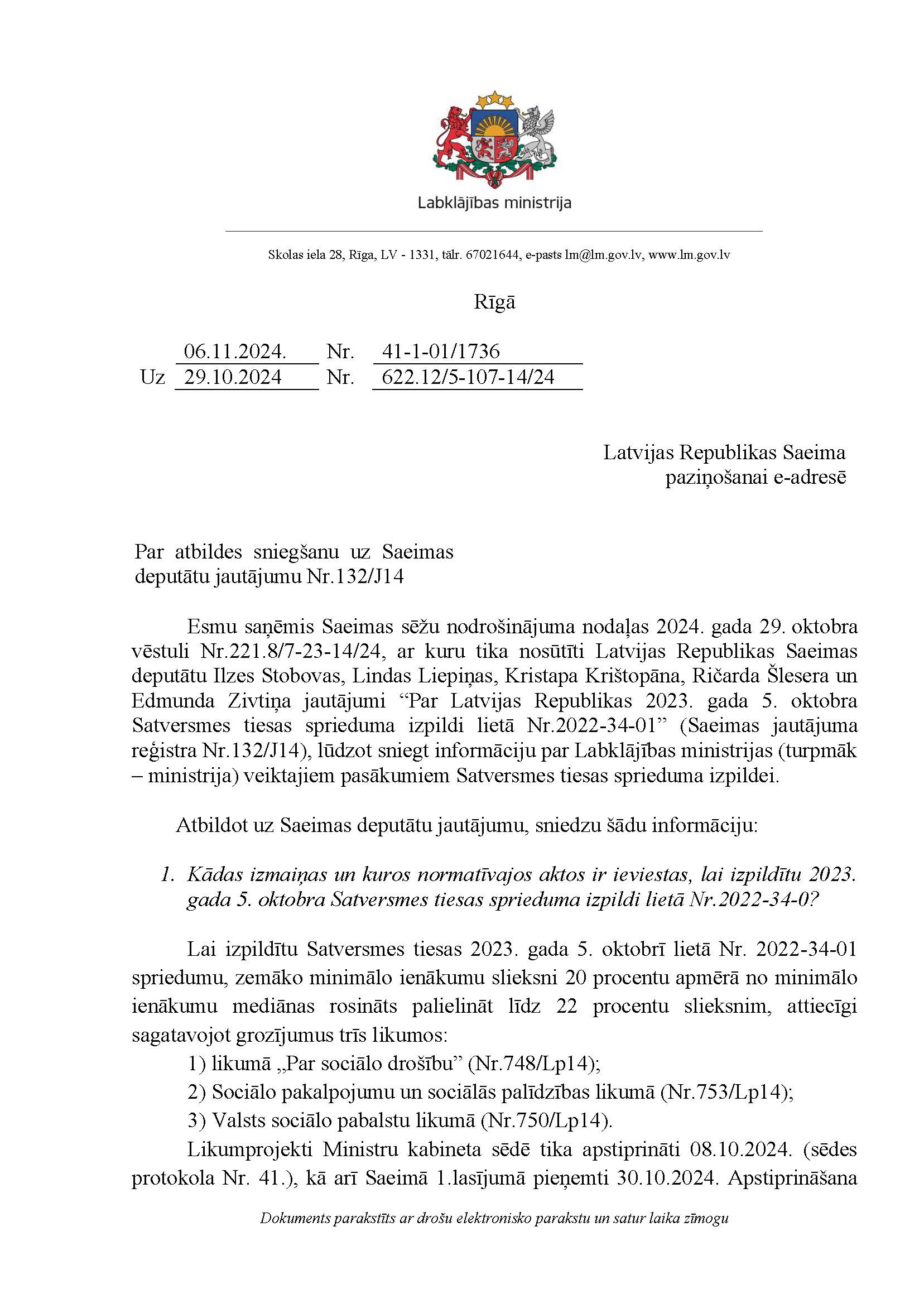 Deputātu Ilzes Stobovas, Lindas Liepiņas, Kristapa Krištopana, Ričarda Šlesera un Edmunda Zivtiņa jautājums labklājības ministram Uldim Augulim "Par Latvijas Republikas 2023. gada 5. oktobra Satversmes tiesas sprieduma izpildi lietā Nr. 2022-34-0". Saņemtā rakstveida atbilde iesniedzējus neapmierina, bet mutvārdos uzdot papildjautājumus viņi nevēlas.