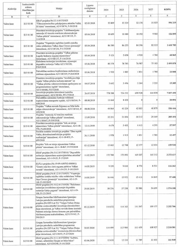 Valkas novada domes saistību apmērs (ņemot vērā plānotos aizņēmumus un pamatsummas maksājuma grafika pārskatīšanu) uz 1.01.2024. ir 37 045 190 EUR, kas 2024. gadā sastāda 15,49 %, 2025. gadā 18,44 %, 2026. gadā 17,98 % pret pamatbudžeta ieņēmumiem.