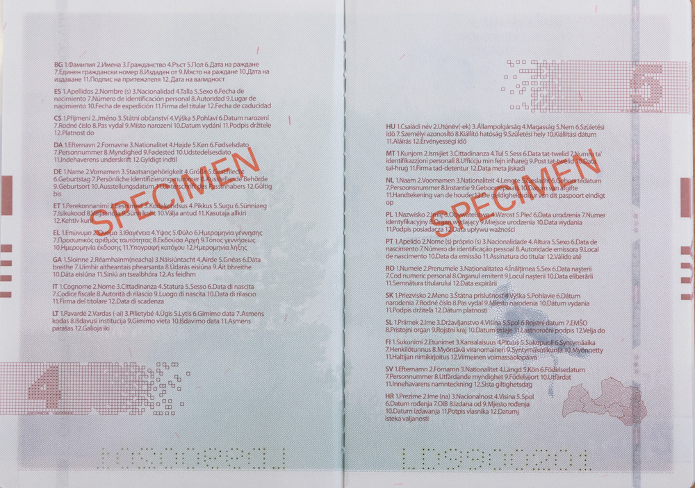 1. Sloinne 2. Réamhainm(neacha) 3. Náisiúntacht 4. Airde 5. Gnéas 6. Dáta breithe 7. Uimhir aitheantais phearsanta 8. Údarás eisiúna 9. Áit bhreithe 10. Dáta eisiúna 11. Síniú an tsealbhóra 12. As feidhm