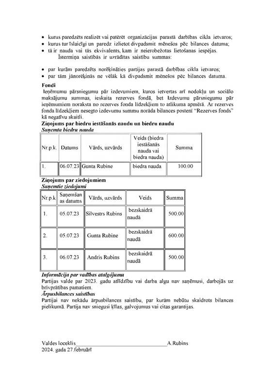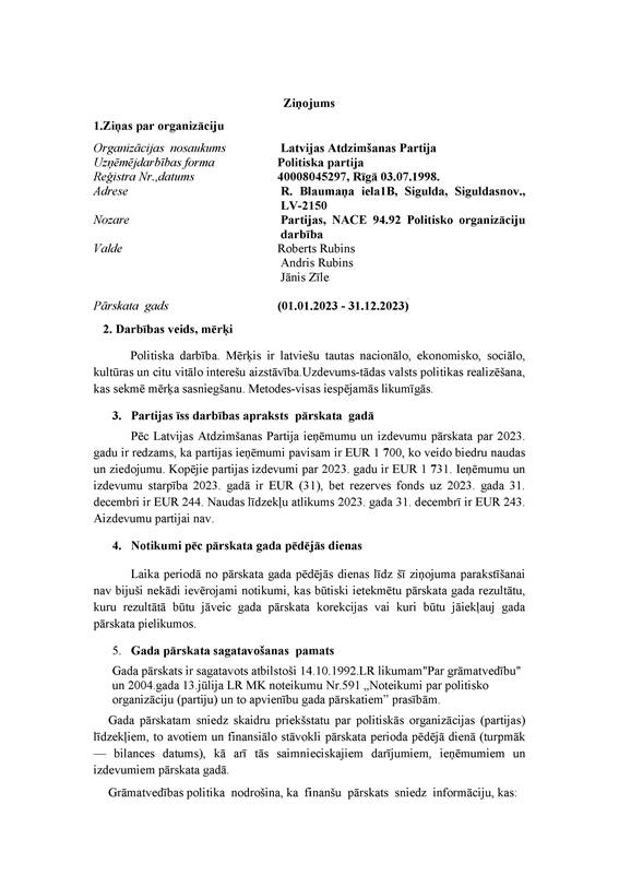 Politiskās partijas "Latvijas Atdzimšanas partija", reģ. Nr. 40008045297, gada pārskatu par 2023. gadu, EUR