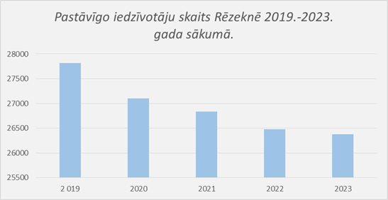 Pēdējo gadu laikā Rēzeknē iedzīvotāju skaita izmaiņām ir ilgstoša negatīva tendence (1. attēls). Pēc Oficiālā statistikas portāla datubāzes informācijas, 2023 gada sākumā Rēzeknes pilsētā bija 26 378 iedzīvotāji (pēc faktiskās dzīvesvietas adreses). Tas ir par 103 iedzīvotājiem mazāk nekā 2022. gada sākumā un par 1442 iedzīvotājiem mazāk nekā 2019. gada sākumā.