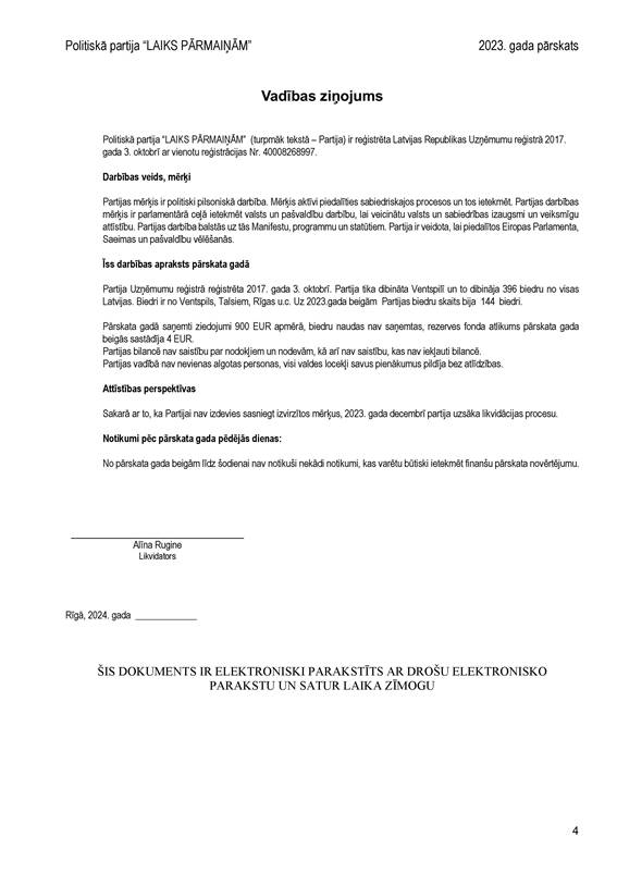 Politiskās partijas "LAIKS PĀRMAIŅĀM", reģ. Nr. 40008268997, gada pārskats par 2023. gadu, EUR
