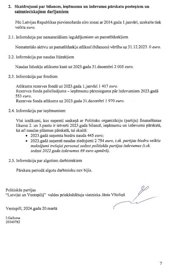 Politiskās partijas "Latvijai un Ventspilij", reģ. Nr. 40008045009, gada pārskats par 2023. gadu, EUR
