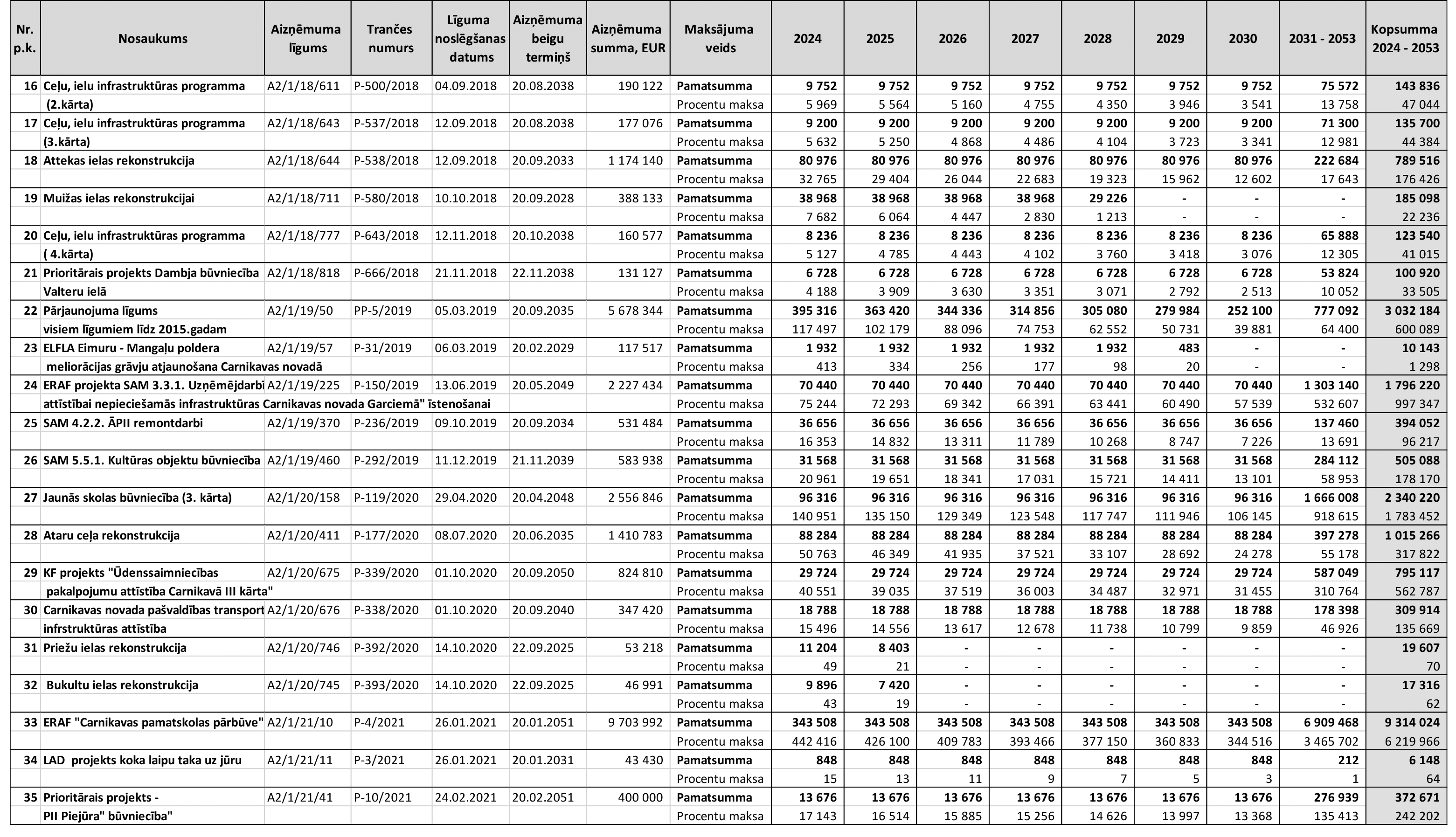 • Noslēdzoties iepirkumam "Liepu alejas pārbūve posmā no Ojāra Vācieša ielas līdz Krastmalas ielai Carnikavā", par saimnieciski visizdevīgāko piedāvājumu tika atzīts piedāvājums ar viszemāko cenu 214614,43 euro bez PVN. Kopējais nepieciešamais finansējums projekta realizācijai ir 263702,46 euro (ieskaitot PVN), tai skaitā, būvniecībai 259683,46 euro, autoruzraudzībai 242 euro un būvuzraudzībai 3777 euro. Projekta realizācijai nepieciešamais finansējums 263703 euro apmērā novirzīts no nesadalītā konta atlikuma, IIN pieauguma rezultātā.