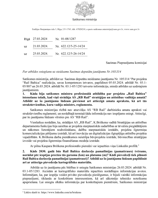 Deputātu Andra Kulberga, Jura Viļuma, Lindas Matisones, Ingmāra Līdakas un Edgara Putras jautājums satiksmes ministram Kasparam Briškenam "Par projekta "Rail Baltica" realizāciju". Saņemtā rakstveida atbilde iesniedzējus neapmierina. Ministrs informē, ka nevar ierasties un sniegt mutvārdu atbildi iepriekš plānotu darbu dēļ, līdz ar to atbilžu sniegšana uz deputātu jautājumiem 2024. gada 27. martā pulksten 17.00 nenotiks.