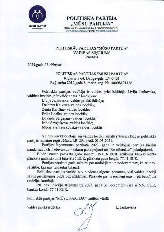 Politiskās partijas "MŪSU PARTIJA", reģ. Nr. 40008191136, gada pārskats par 2023. gadu, EUR