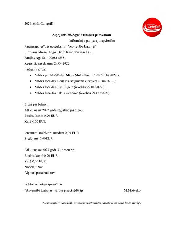 Politisko partiju apvienības "Tauta. Zeme. Valstiskums" (līdz 18.03.2024. Apvienība Latvijai"), reģ. Nr. 40008315581, gada pārskats par 2023. gadu, EUR
