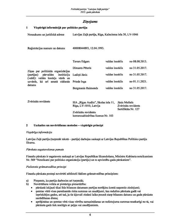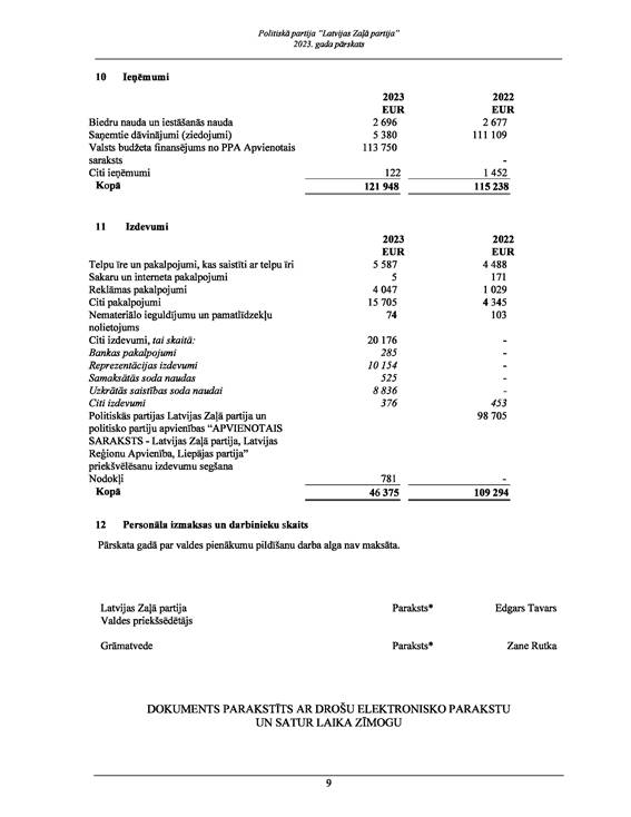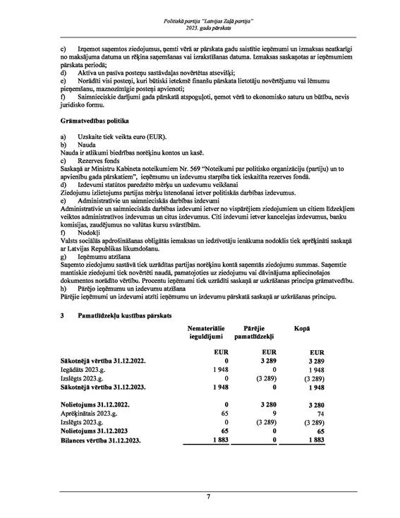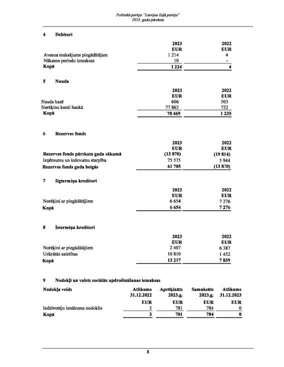 Politiskās partijas "Latvijas Zaļā partija", reģ. Nr. 40008044893, gada pārskats par 2023. gadu, EUR