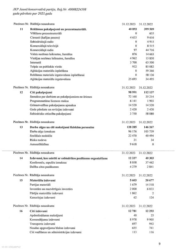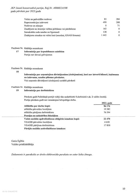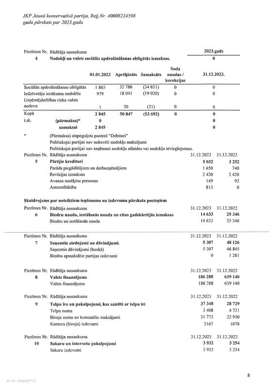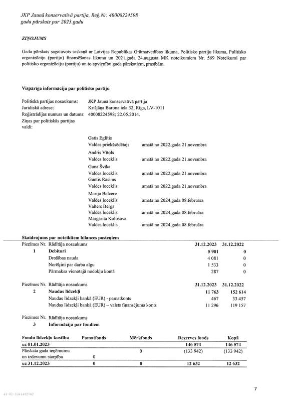 Politiskās partijas "JKP Jaunā konservatīvā partija" (līdz 01.12.2023. politiskā partija "Konservatīvie", reģ. Nr. 40008224598, gada pārskats par 2023. gadu, EUR