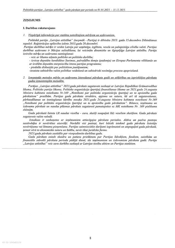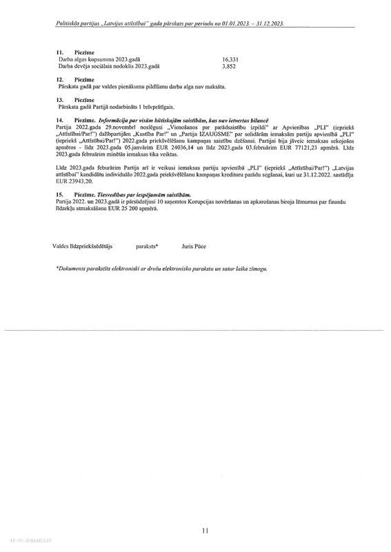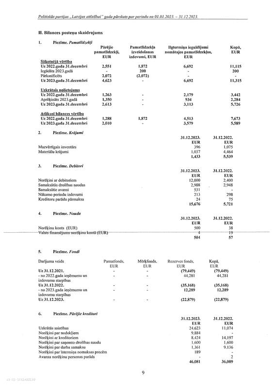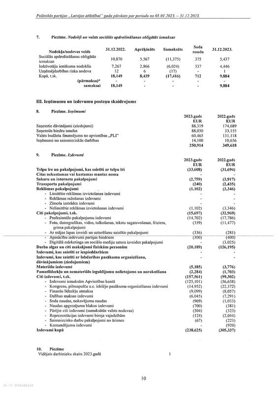 Politiskās partijas "Latvijas attīstībai", reģ. Nr. 40008218695, gada pārskats par 2023. gadu, EUR