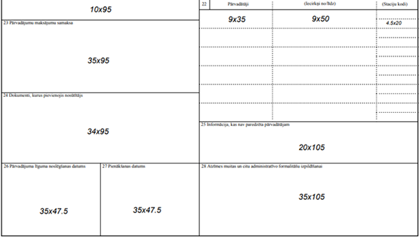21. Ja pavadzīmes 15. ailes "Kravas nosaukums" laukā līdz punktētajai līnijai vai laukā zem tās nepietiek vietas, ziņas var izvietot, izmantojot visu šīs ailes lauku.
