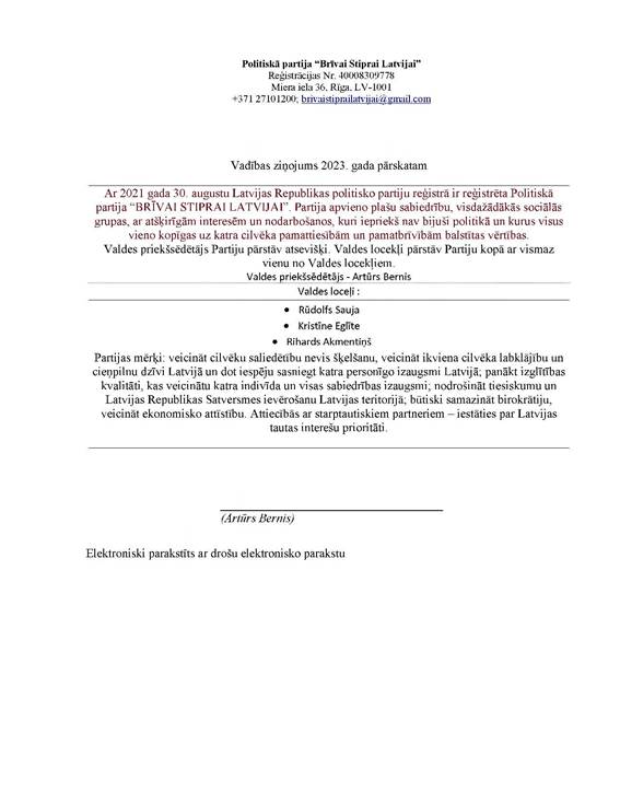 Politiskās partijas "BRĪVAI STIPRAI LATVIJAI", reģ. Nr. 40008309778, gada pārskats par 2023. gadu, EUR