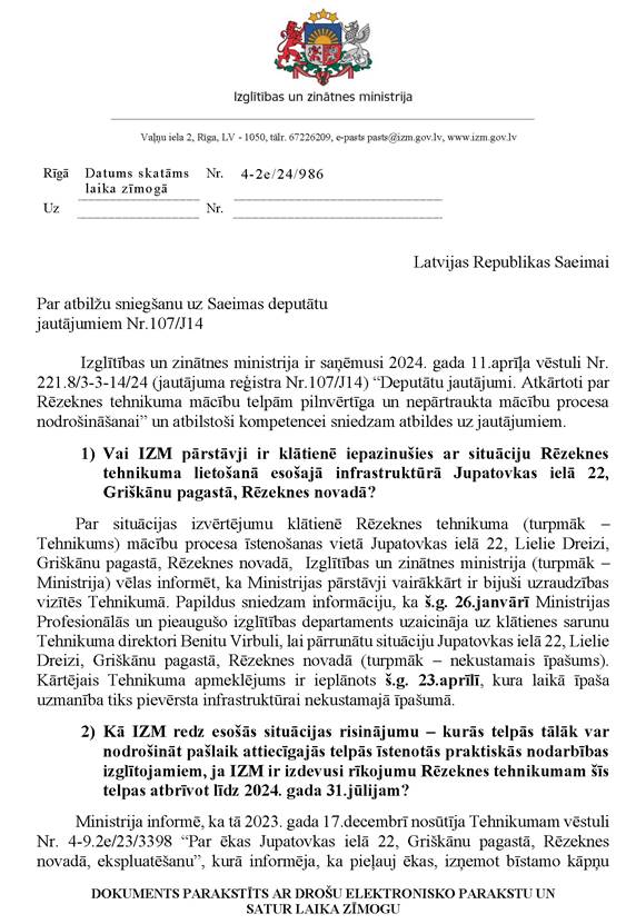 Deputāti Juris Viļums, Česlavs Batņa, Edmunds Teirumnieks, Vilis Krištopans un Viktorija Pleškāne ir iesnieguši jautājumu izglītības un zinātnes ministrei Andai Čakšai "Atkārtoti par Rēzeknes tehnikuma mācību telpām pilnvērtīga un nepārtraukta mācību procesa nodrošināšanai". Jautājums tika iesniegts 11. aprīlī. Uz šo jautājumu ir saņemta rakstveida atbilde, taču jautājuma uzdevēji nav apmierināti ar to un vēlas saņemt papildu paskaidrojumus un uzdot papildu jautājumus.