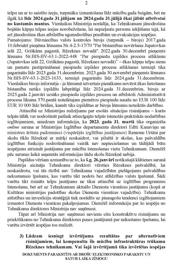 Varbūt tagad jūs varat pastāstīt, kas šīs tikšanās rezultātā tika noskaidrots, kādi secinājumi izdarīti, kādas ir papildu domas, kā varētu risināt Rēzeknes tehnikuma telpu pieejamības jautājumu.