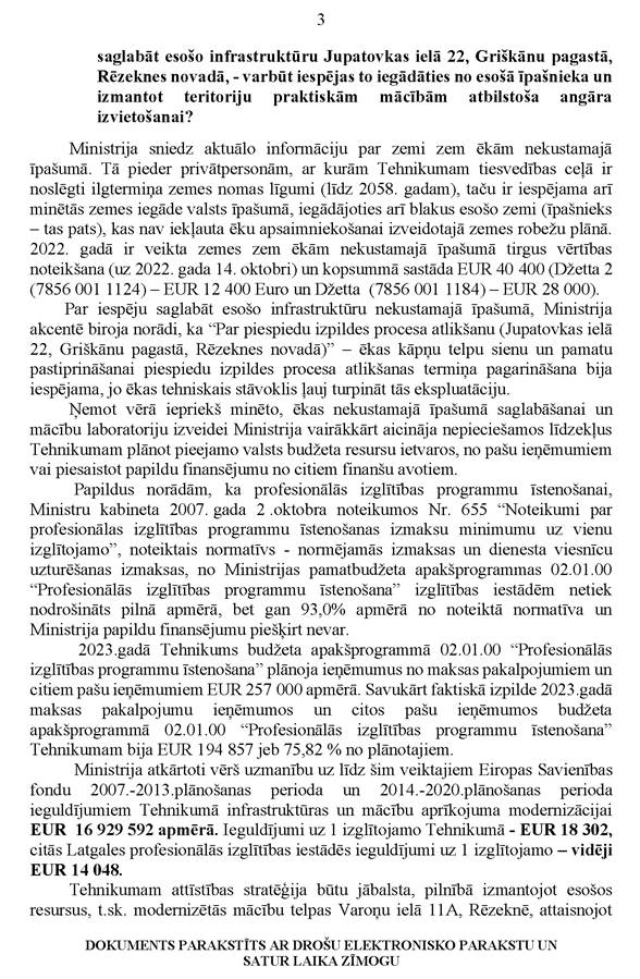 Otrs jautājums būs... Jūs pieminējāt Eiropas struktūrfondus – ka, pēc jūsu aprēķiniem, Rēzeknes tehnikumam ir bijušas salīdzinoši lielākas summas, bet, ņemot vērā, ka arī šī tehnikuma attīstības stratēģijā līdz 2027. gadam konkrētās ēkas, kas tiek izmantotas mācību procesa nodrošināšanai praktiskajām nodarbībām... ir ierakstīts, ka tās līdz 2027. gadam tiks izmantotas (acīmredzot to savulaik arī ministrija ir akceptējusi), tad ir jautājums: vai ministrija ir meklējusi iespējas šī gada ietvaros atrast līdzekļus (pēc man zināmās informācijas, tie ir apmēram 300 tūkstoši) ministrijas... nu, esošajā finansējumā? Vai tas tika apsvērts?