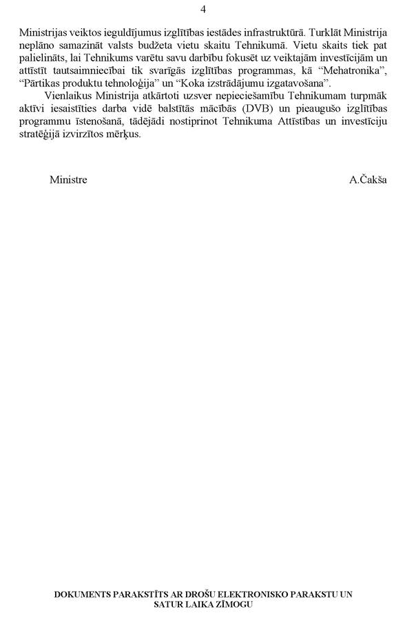 Ministrijas pārstāvji bija Rēzeknē un runāja ar vadītāju. Šobrīd tā rīcība, kas notiek tehnikumā, ne pilnībā atbilst tam, kā viņi paši ir norādījuši savā attīstības stratēģijā, līdz ar to ir svarīgi, ka mēs... kā vēl viens no tādiem izaicinājumiem... tehnikumā vairāk izvērst pieaugušo apmācību, nodrošinot arī šos mazos moduļus. Nu, tas būs diezgan intensīvs darbs arī ar tehnikuma direktori.