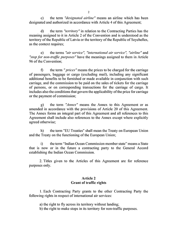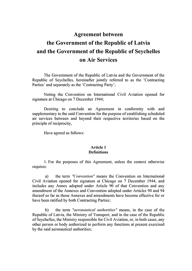 Par Latvijas Republikas valdības un Seišelu Republikas valdības nolīgumu par gaisa satiksmi