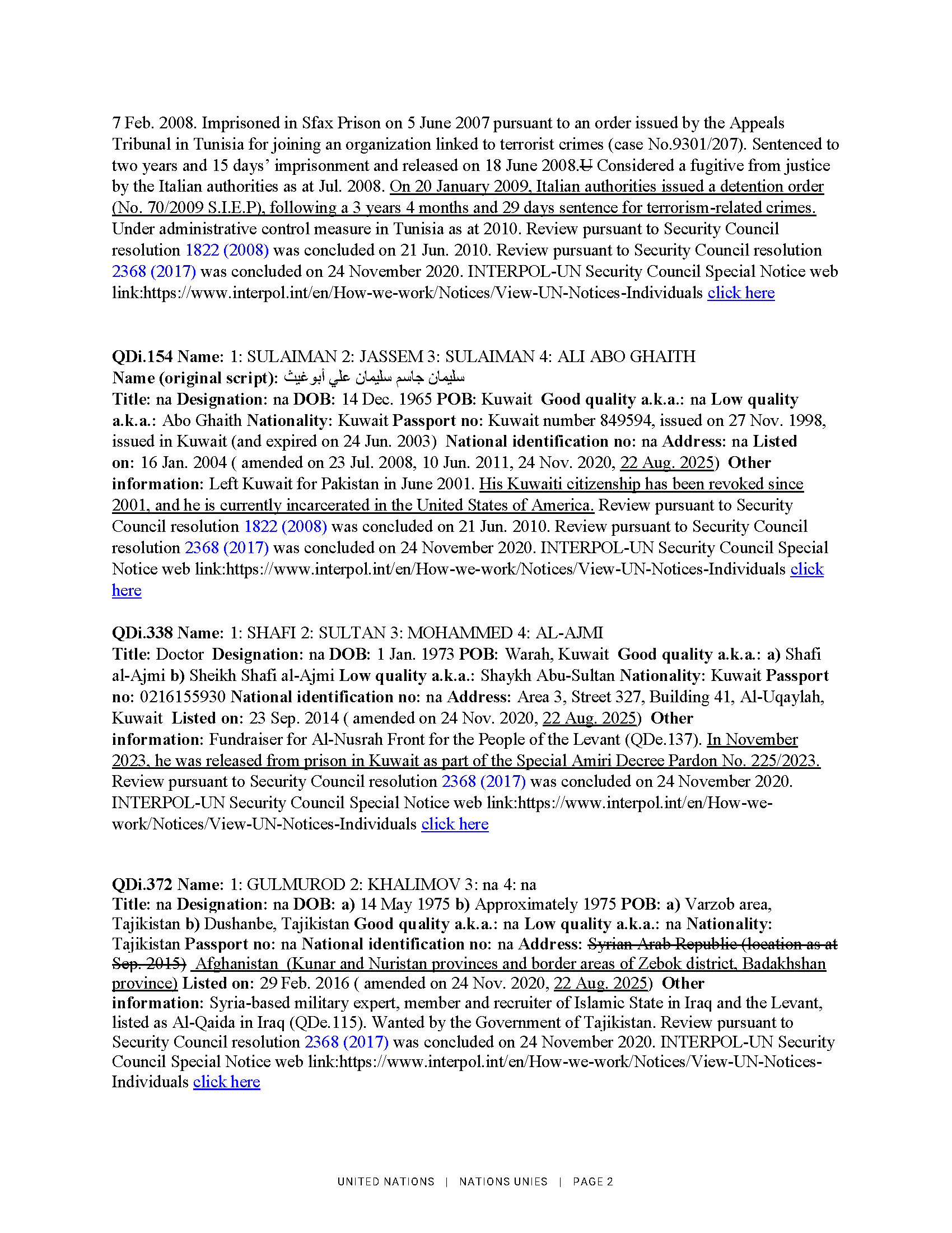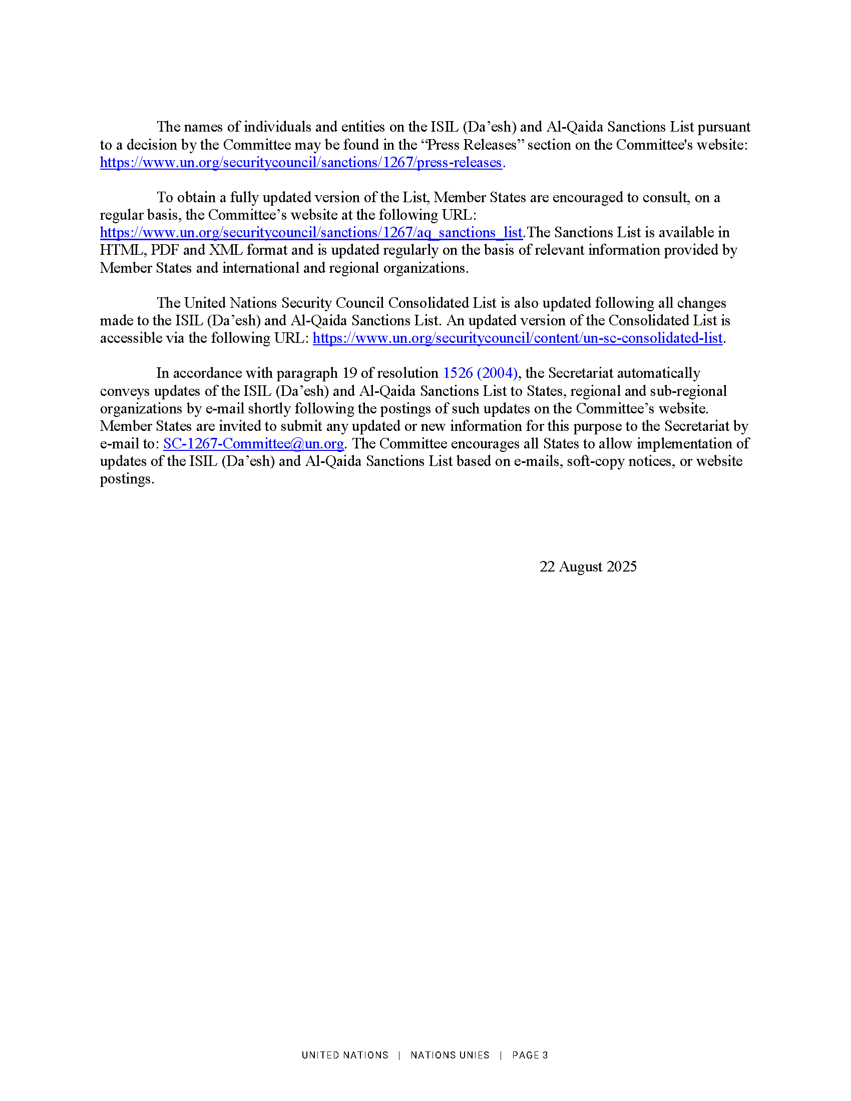 2025. gada 22. augustā ANO Drošības padome saskaņā ar rezolūciju Nr. 1267 (1999), 1989 (2011) un 2253 (2015) ir noteikusi sankcijas pret diviem Kuveitas pilsoņiem, vienu Lībijas pilsoni, vienu Tunisijas pilsoni un vienu Tadžikistānas pilsoni. Lūgums skatīt ANO notu un skaidrojošo informāciju pielikumā.