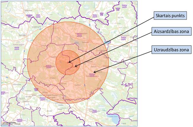 2. Karantīnu ar uzraudzības zonu Ogres novada Lauberes, Madlienas, Lēdmanes, Suntažu, Ķeipenes, Taurupes un Krapes pagastā, 10 kilometru rādiusā ap ĀCM skarto dzīvnieku turēšanas vietu (skatīt šī rīkojuma pielikumu).
