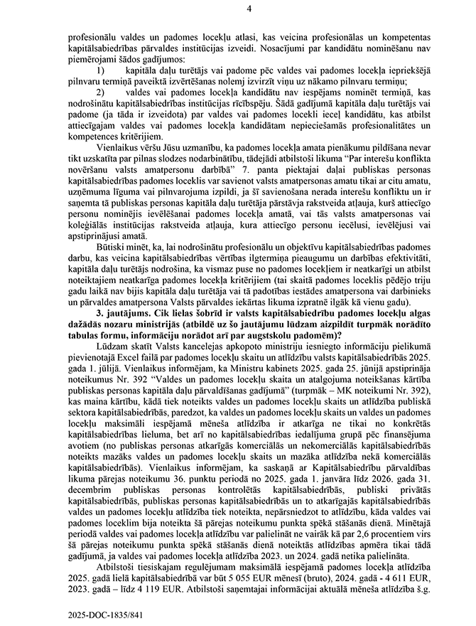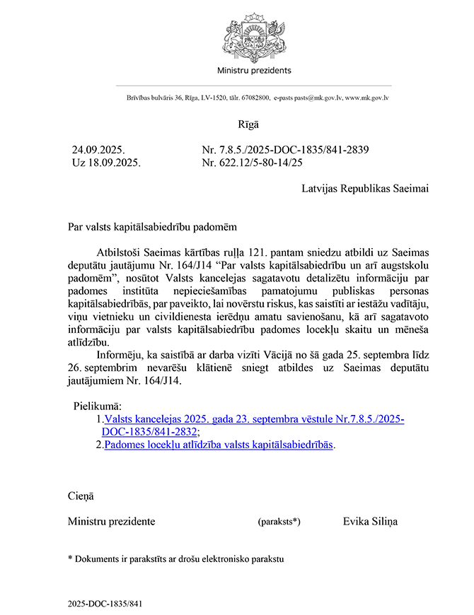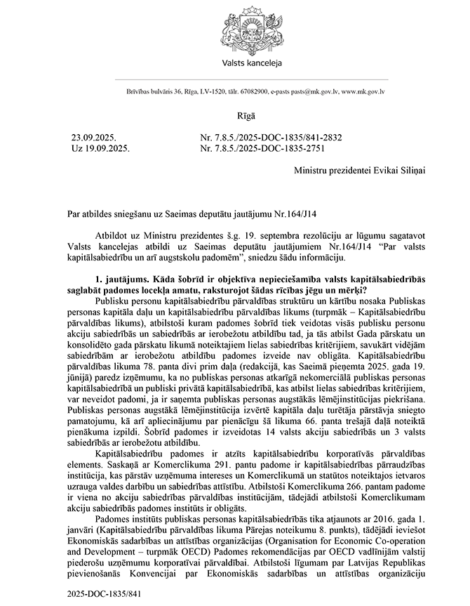 Deputātu Edgara Tavara, Ingmāra Līdakas, Lindas Matisones, Česlava Batņas un Raimonda Bergmaņa jautājums Ministru prezidentei Evikai Siliņai "Par valsts kapitālsabiedrību un arī augstskolu padomēm". Saņemtā rakstveida atbilde iesniedzējus neapmierina, bet mutvārdos papildjautājumus iesniedzēji uzdot nevēlas.