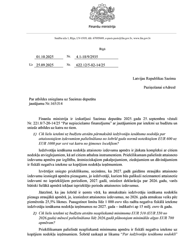 Šī neapliekamā minimuma palielināšana, kas tika izdarīta... tā vietā bija nevis jāpalielina neapliekamais minimums visiem, bet bija jāpalielina atvieglojums par apgādībā esošu personu, 10 eiro, kurus pielika pie neapliekamā minimuma... tie būtu apmēram 27 eiro, kurus varētu pielikt pie atvieglojuma par apgādībā esošu personu. Tas bija jādara, un tas nav izdarīts.