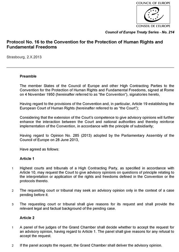 1. Augsto Līgumslēdzēju Pušu augstākā līmeņa tiesas, kas noteiktas 10. pantā norādītajā kārtībā, var lūgt Tiesu sniegt konsultatīvus atzinumus par principiāliem jautājumiem attiecībā uz Konvencijā vai tās protokolos noteikto tiesību un brīvību interpretāciju vai piemērošanu.
