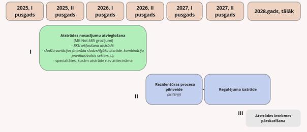 II SOLIS: Turpināt rezidentūras procesa pilnveidi. III SOLIS: Atstrādes normas pārskatīšana ar mērķi virzīties uz atstrādes atcelšanu :