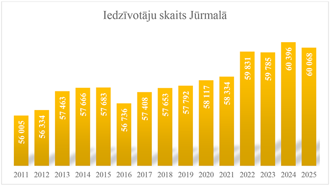 Pēc Pilsonības un migrācijas lietu pārvaldes (turpmāk – PMLP) 2025. gada 01. jūlija datiem, Jūrmalas valstspilsētā ir 60 068 iedzīvotāji (sk. 1. attēlu). Laika posmā no 2011. gada līdz 2025. gadam vērojams iedzīvotāju skaita pieaugums par 7,25 %. Pēdējā gada laikā iedzīvotāju skaits ir nedaudz samazinājies par 0,54 %, jeb 328 iedzīvotājiem.