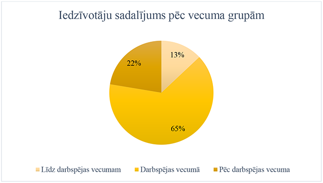 Kā liecina PMLP dati, Jūrmalas valstspilsētas iedzīvotāju procentuāli lielākā daļa no kopējā iedzīvotāju skaita ir darbspējas vecumā, proti, 38 826 iedzīvotāji. Pēc darbspējas vecuma iedzīvotāji ir 13 449 un pirms darbspējas vecumā – 7 793 iedzīvotāji. Jūrmalas valstspilsētas iedzīvotāju vecuma struktūra (informācija uz 2025. gada 01. jūliju) ir attēlota 2. attēlā.