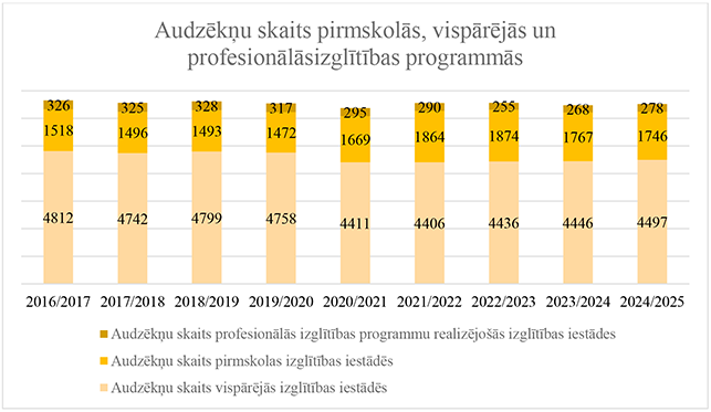 Atbilstoši Latvijas Republikas Izglītības ministrijas datiem Jūrmalas valstspilsētas izglītības iestādēs 2024./2025. mācību gada sākumā bija reģistrēts 6521 audzēknis, no kuriem 1746 uzsāka gaitas pirmsskolas izglītības iestādēs, 4497 vispārējās izglītības iestādēs un 278 profesionālās izglītības programmas realizējošās izglītības iestādēs. 2024./ 2025. mācību gada sākumā, salīdzinot ar iepriekšējo periodu, kopējais audzēkņu skaits ir nedaudz palielinājies (skat. 3. attēlu).