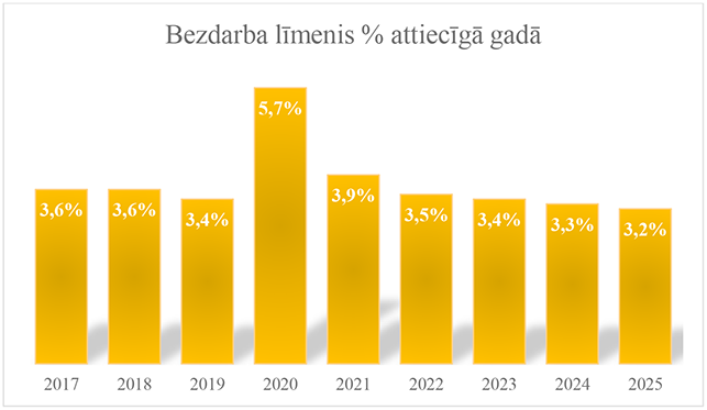 Kā liecina Nodarbinātības valsts aģentūras dati (turpmāk – NVA), Jūrmalā bezdarba līmenis 2025. gadā bija 3,2 %, kas ir zemāk nekā vidēji Latvijā (3,8 %). Salīdzinoši ar 2024. gadu bezdarba līmenis ir samazinājies par 0,1 % (skat. 4. attēlu).