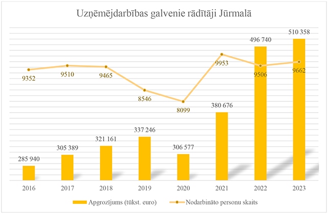 Ņemot vērā Covid-19 pandēmijas izplatību, tās rezultātā ieviestos ierobežojumus un Jūrmalas valstspilsētā reģistrēto uzņēmumu pamatdarbību, kas tika tieši skarta, apgrozījums 2020. gadā samazinājās par vairāk kā 30 tūkstošiem euro salīdzinājumā ar 2019. gadu, taču 2021. gadā apgrozījums pat pārsniedza 2019. gada rādītājus un 2022. gadā, kā arī 2023. gadā tas turpinājis ievērojami palielināties – 2023. gadā pārsniedzot 2019. gada rādītājus par vairāk kā 170 tūkstošiem euro. Nodarbināto personu skaits sāka sarukt jau pirms Covid-19 pandēmijas izplatības, taču 2021. gadā ir bijis lielākais nodarbināto personu skaits pēdējo gadu laikā, sasniedzot 9953 nodarbinātas personas. 2022. gadā tas ir samazinājies uz 9506 nodarbinātām personām, bet 2023. gadā nedaudz palielinājies uz 9662 nodarbinātām personām. (skat. 5. attēlu).