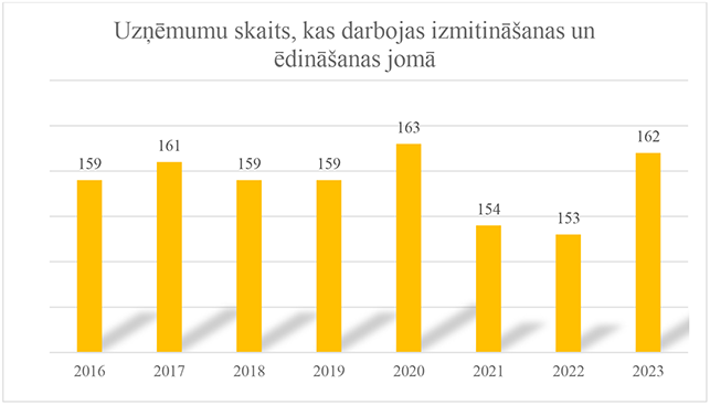 Kā liecina Centrālās statistikas pārvaldes (turpmāk – CSP) informācija, Jūrmalas valstspilsētā reģistrēto uzņēmumu skaits, kas darbojas izmitināšanas un ēdināšanas jomā (NACE 2. red.), pēdējos gados ir bijis ļoti svārstīgs. Viesmīlības jomas uzņēmumi pandēmijas gados saskārās ar nopietniem izaicinājumiem, tādēļ 2021. gadā Jūrmalas valstspilsētā darbojās 154 izmitināšanas un ēdināšanas uzņēmumi un 2022. gadā 153, kas ir mazākais skaits pēdējo gadu periodā, bet 2023. gadā vērojams straujš skaita palielinājums un Jūrmalas valstspilsētā darbojās 162 izmitināšanas un ēdināšanas uzņēmumi, kas gandrīz sasniedz 2020. gada skaitu. (skat. 6. attēlu).