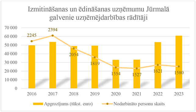 Laika periodā no 2017. gada līdz 2021. gadam vērojama uzņēmumu, kuru darbības nozare ir saistīta ar izmitināšanas un ēdināšanas pakalpojumiem, nodarbināto personu skaita sarukums, 2022. gadā skaits nedaudz palielinājies, tomēr 2023. gadā nedaudz samazinājies. Svārstīga situācija ir bijusi ar šo uzņēmumu apgrozījumu – 2020. gadā ir piedzīvots ievērojams apgrozījuma kritums, tomēr 2022. gadā apgrozījums ievērojami palielinājies, kas sasniedzis 2017. gada rādījumus un 2023. gadā turpinājis palielināties, ievērojami pārsniedzot 2017. gada rādījumus. (skat. 7. attēlu).