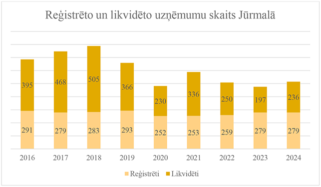 Atbilstoši Lursoft statistikas datiem 2024. gadā Jūrmalā ir likvidēti 236 uzņēmumi un ir reģistrēti 279 jauni uzņēmumi (skat. 8. attēlu), salīdzinoši ar 2023. gadu ir pieaudzis likvidēto un palicis nemainīgs reģistrēto uzņēmumu skaits. 2024. gadā Latvijā reģistrēti 9320 jauni uzņēmumi, bet likvidēti 9433 uzņēmumi, liecina Lursoft apkopotā informācija. Salīdzinot ar 2023. gadu, jaunreģistrēto uzņēmumu skaits ir palielinājies un palielinājies arī likvidēto uzņēmumu skaits. Lursoft apkopotā informācija parāda, ka 2024. gadā likvidēto uzņēmumu bijis par aptuveni 1,6 tūkstošiem vairāk nekā 2023. gadā.