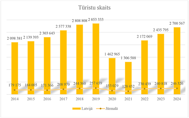 Saskaņā ar CSP datiem, tūristu skaits Jūrmalā 2024. gadā ir pieaudzis par 2,3 %, salīdzinot ar 2023. gadu, un tas ir mazāk nekā vidēji valstī, kur tūristu skaits pieaudzis par 10,9 % (skat. 9. attēlu). Lai gan tūristu skaits pieaug, tas joprojām nav sasniedzis 2019. gada apjomus (Jūrmalā -4,4 %). Jūrmala joprojām ir saglabājusies kā otrs populārākais galamērķis vietējo un ārvalstu tūristu vidū. Analizējot pilsētas viesu sadalījumu pa valstīm, Latvija ir bijusi nozīmīgākā tūristu ģenerējošā valsts (aptuveni 46 % no kopējā tūristu skaita), kam seko pārējās Baltijas valstis. Jūlijā un augustā tūristu skaits no Lietuvas bija lielāks nekā vietējo tūristu skaits. Jāpiebilst, ka kopš 2019. gada, kas tūrismā ir bijusi visveiksmīgākā sezona, tūristu skaits no Lietuvas ir gandrīz divkāršojies.
