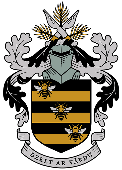 2. Dravnieku dzimtas ģerbonis (Melnā laukā trīs zelta sijas; uz katras pa augšupvērstai zelta-melnai bitei ar sudraba spārniem, liktas labās spāres virzienā. Tērauda smailķivere pārsegta ar sudraba-melnu grīsti, kleinodā izaugošas sudraba augšupvērstas rakstāmspalvas sakrustotas šķērskrustā, starp tām melni priežu zari ar zelta skujām. Lambrekeni: melns, sudrabs. Devīze ar melnu uz sudraba lentes: DZELT AR VĀRDU.) – reģistrēts 2025. gada 22. decembrī.